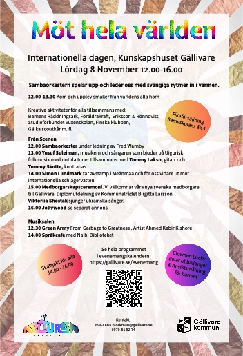 Internationella dagen i Gällivare! Vi kommer att finnas med och visa ett bildspel som kommer att spegla hur vi hjälper utsatta barn med skola och utbildning i Bolivia. Varmt välkomna till Kunskapshuset i Gällivare på lördag den 8 nov mellan klockan 12-16. Se hela programmet MÖT HELA VÄRLDEN